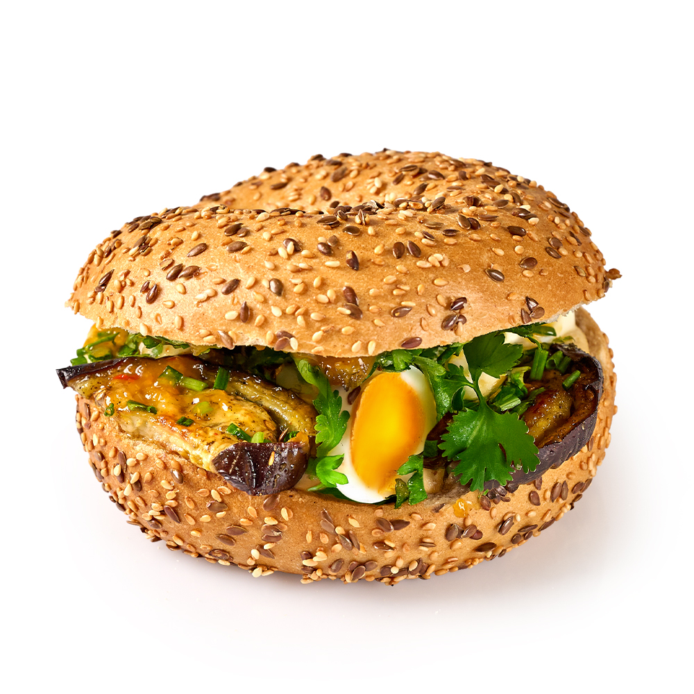 Nasza najnowsza kanapka w bajglu z dodatkiem sezamu i siemienia lnianego. W środku znajdziecie kremowy hummus, bakłażana pieczonego w miodzie i zaatarze, jajko z wolnego wybiegu oraz aromatyczny relish mango. Zawartość białka to aż 13,4%!