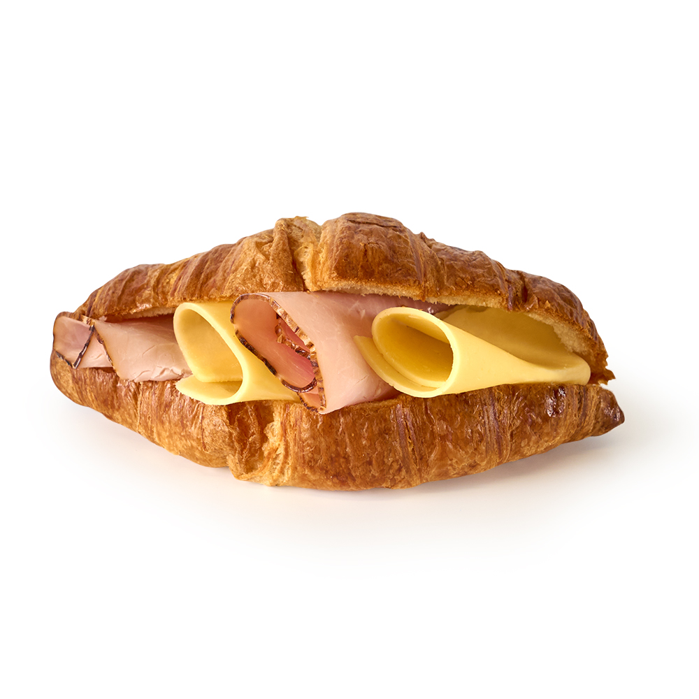 Bazą naszej przekąski jest klasyczny, delikatny rogalik z chrupiącą skórką, wyrabiany własnoręcznie na prawdziwym maśle. Wypełniony szynką oraz dojrzewającym serem, tworzy wytrawną kompozycję, która sprawdzi się w każdej podróży.