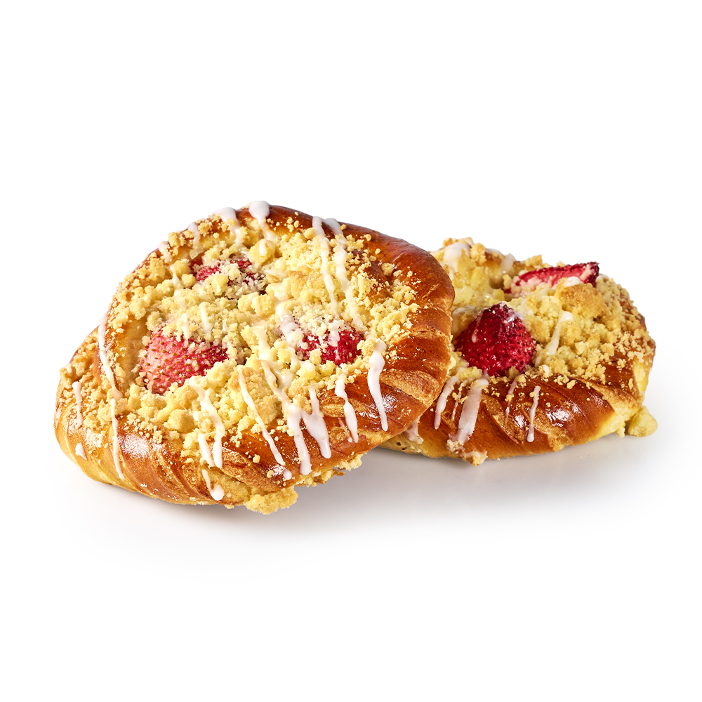Ręcznie zawijane drożdżówki. Przewałkowane masłem co nadaje im wyjątkowo maślany aromat. Bogato zdobiona grubą kruszonką. Oblana lukrem. Z owocami sezonowymi.