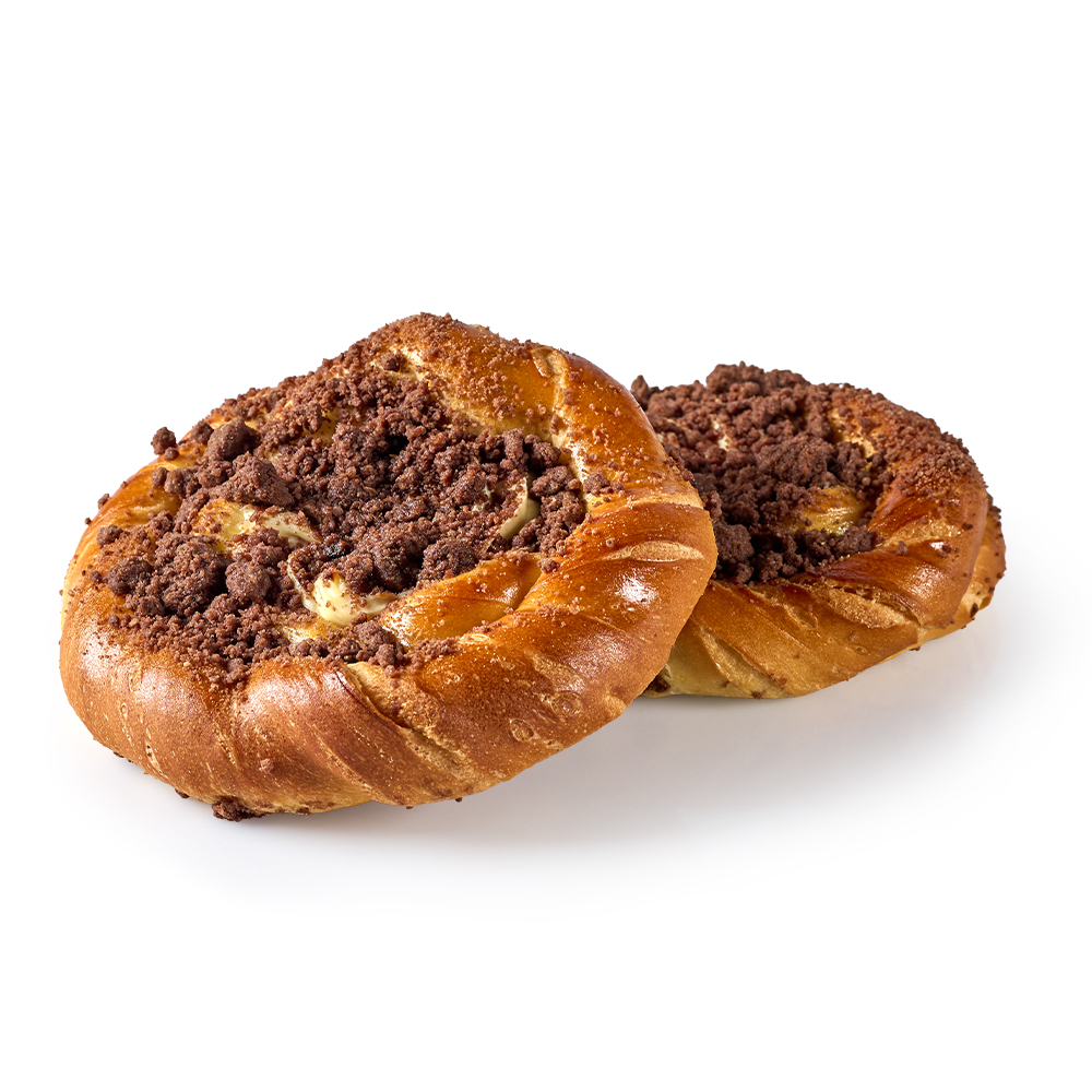 Ręcznie zawijane drożdżówki. Przewałkowane masłem co nadaje im wyjątkowo maślany aromat. W środku słodki ser, a na wierzchu bogata, gruba kruszonka z nutą kakao.