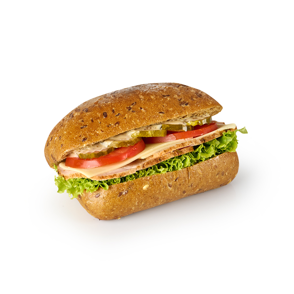 - bułka ciabatta żytnia [woda, mąka ŻYTNIA, grysik pszenny (PSZENICA, woda), gluten PSZENNY, nasiona siemienia lnianego, olej rzepakowy, płatki OWSIANE, mąka PSZENNA, ziarna słonecznika, sól, drożdże, słód JĘCZMIENNY, żytni ekstrakt słodowy (słód ŻYTNI, woda), środek do przetwarzania mąki: kwas askorbinowy],