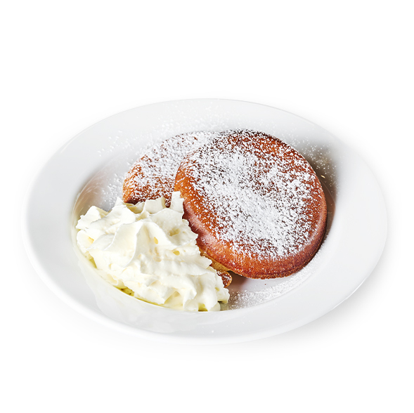 Puszyste Pancakes podane z bitą śmietaną i posypane cukrem pudrem. Idealne na śniadanie i deser.