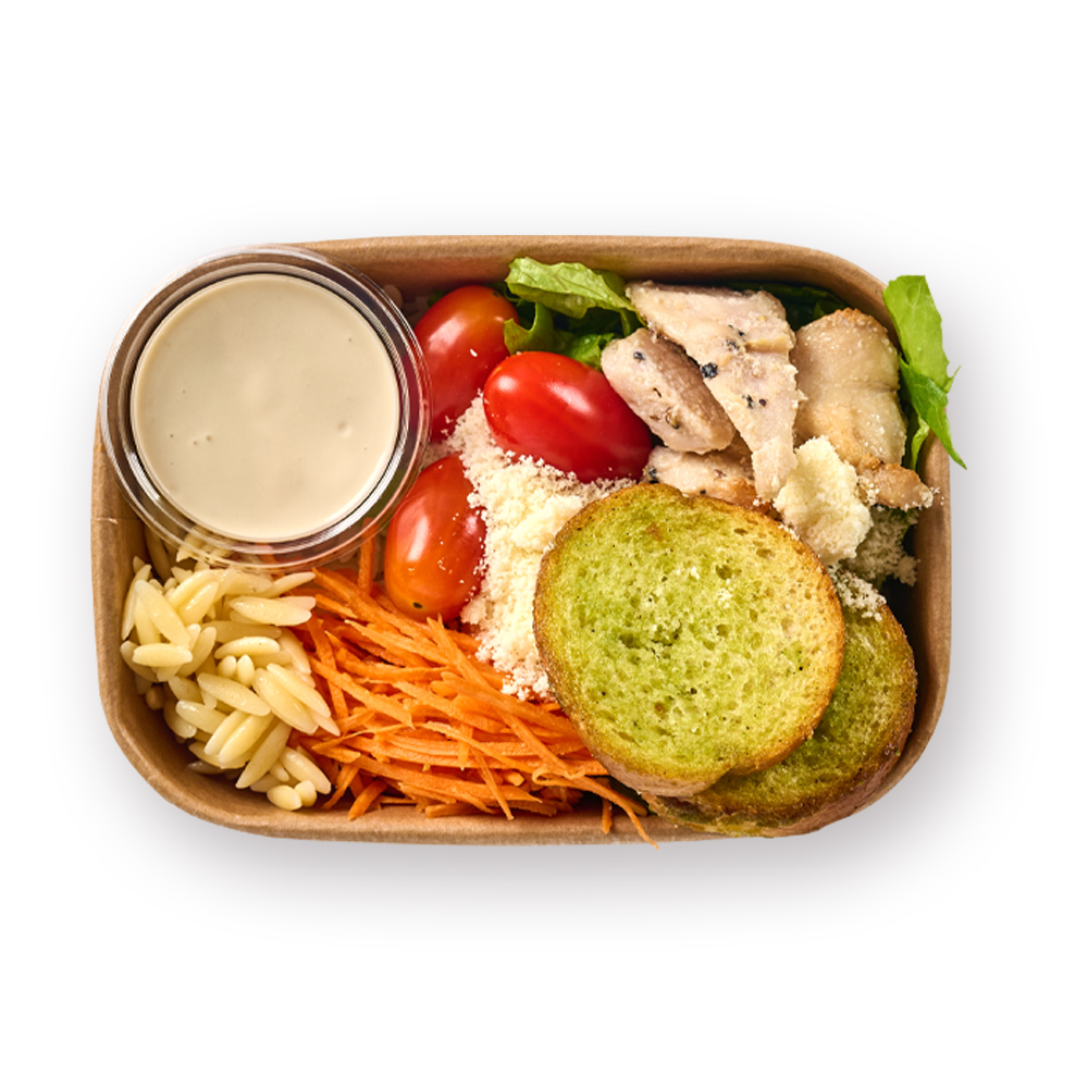 Sałatka z makaronem orzo, pomidorkami koktajlowymi i kawałkami pieczonej piersi kurczaka sielskiego. Wzbogacona chrupiącą sałatą rzymską, grzankami, marchewką oraz delikatnym sosem majonezowym. Posypana serem dojrzewającym. Idealna jako lekka przekąska lub pożywne drugie śniadanie.